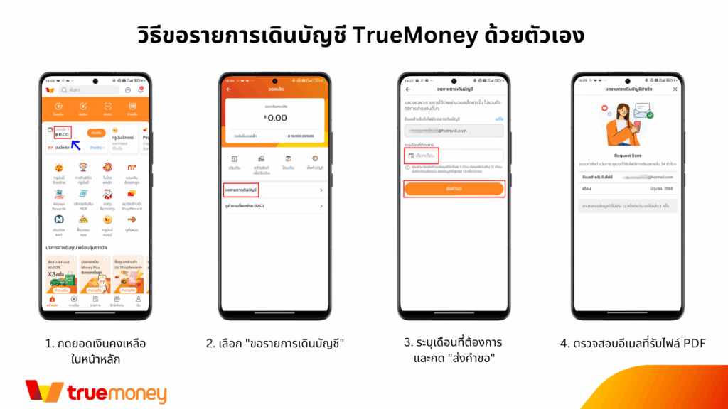 • หากต้องการขอรายการย้อนหลังเกิน 12 เดือน กรุณาดาวน์โหลดแบบฟอร์ม คลิกที่นี่ กรอกข้อมูลให้ครบถ้วน และส่งเอกสารกลับมาที่ customercare@truemoney.com
